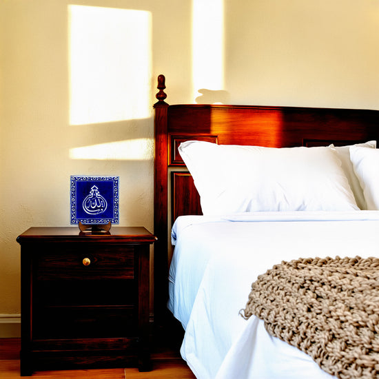 Bu el yapımı İznik çini karo, merkezinde yer alan “Maşallah” yazısını klasik hat anlayışıyla sunar. İslam kültüründe hayranlık ve şükür ifadesi olarak kullanılan bu kelime, geleneksel bordür düzeniyle birlikte dengeli bir yüzey kompozisyonu içinde ele alınır. Desen tasarımı Serap Ereyli’ye aittir.