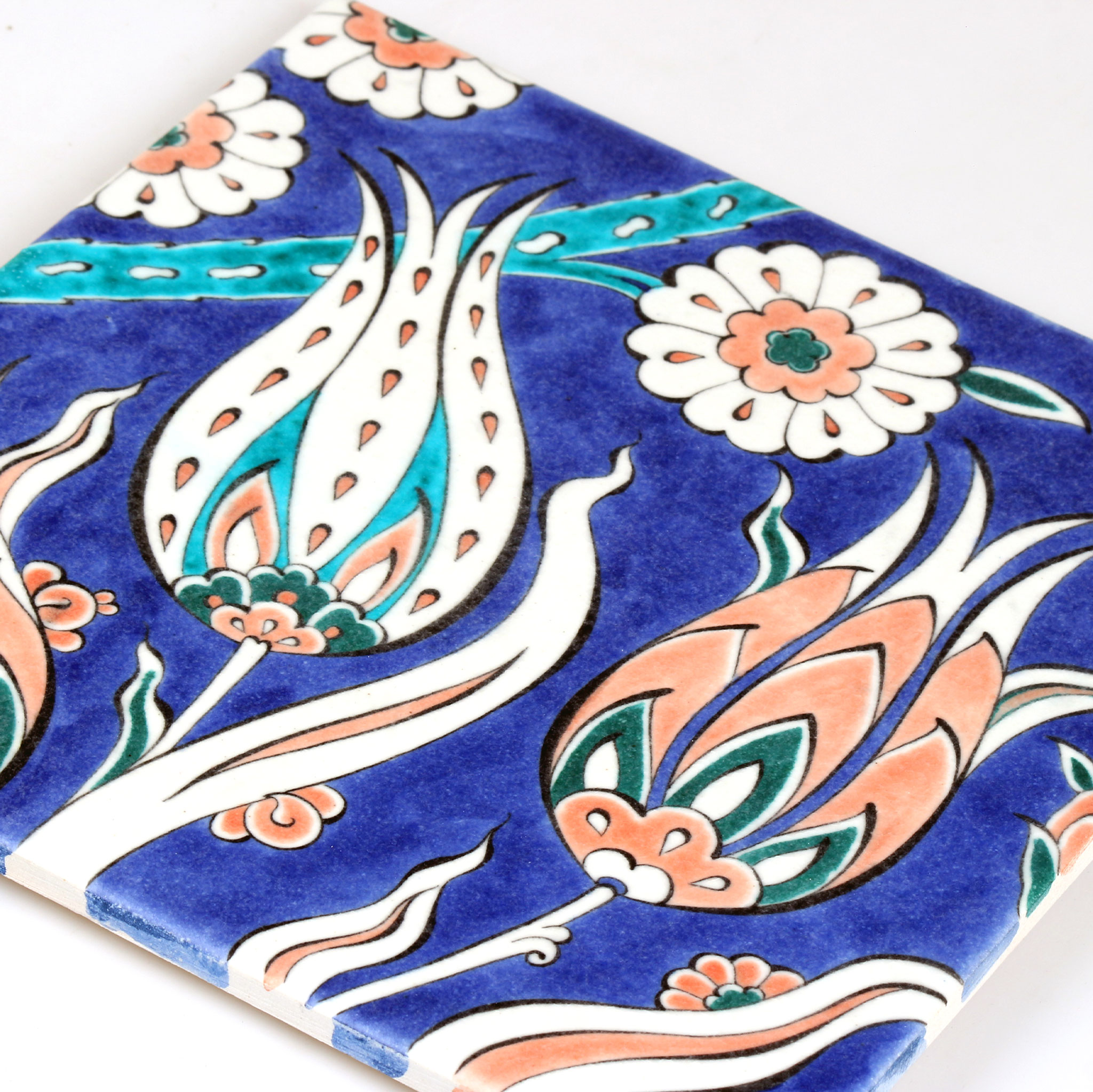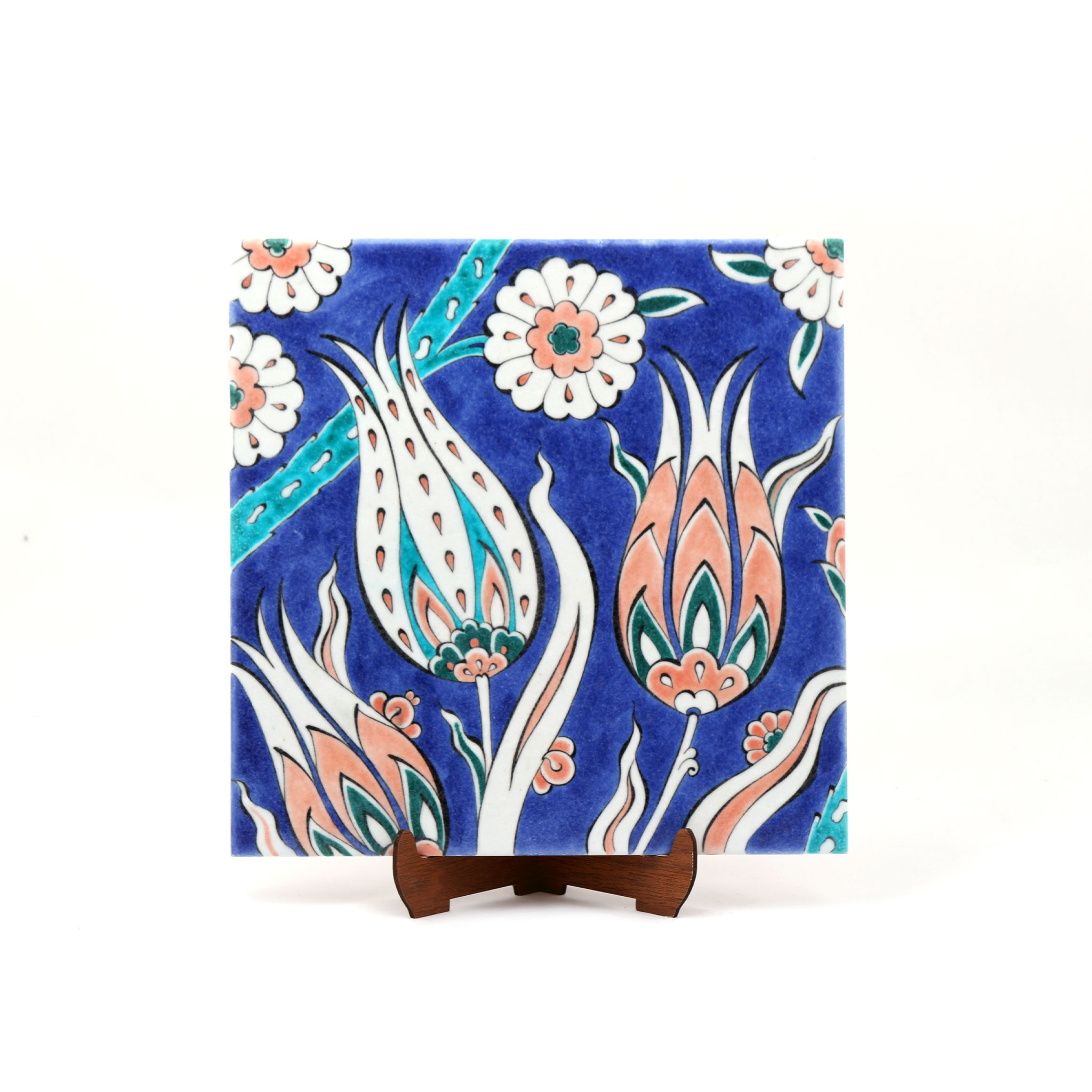 This composition is a framed study inspired by one of the tile panels in Topkapı Palace. On a cobalt blue background, stylized tulips in white and coral tones, along with small floral motifs, are enriched with turquoise branches interspersed throughout. Unlike other Iznik tiles, these works are coated with a semi-matte glaze, producing a subtle matte effect reminiscent of certain Ottoman-period Iznik tiles and evoking the look of antique pieces. Each Iznik tile is entirely handcrafted by master artisans.