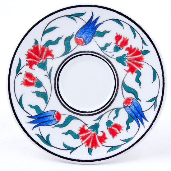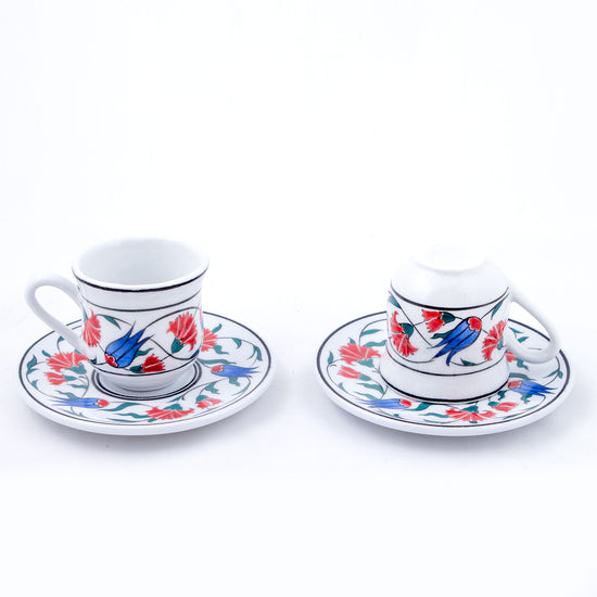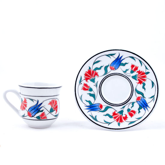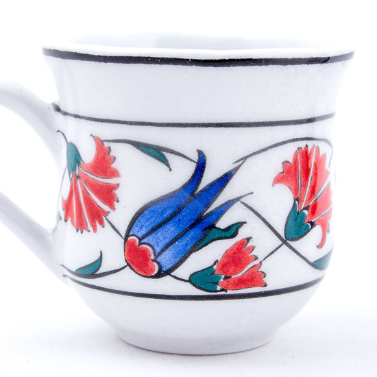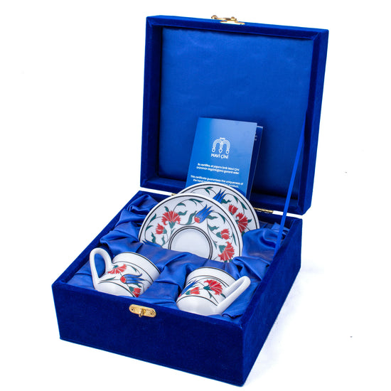Türk kahvesi kültürünün köklü geleneğini, İznik çinisinin eşsiz renk ve motifleriyle bir araya getirdik. Kendi reçetemizle hazırlanan ve yüksek oranda kuvars içeren çini hamuruyla şekillendirilen her fincan; astarlama, dekorlama, sırlama ve fırınlama aşamalarının tamamında el emeğiyle titizlikle üretilir. Lale ve karanfil motifleriyle süslenen çini fincanlar, günlük kahve rutininize ince bir sanat dokunuşu ekler. Hem günlük kullanım hem de koleksiyon değeri için ideal bir parçadır.