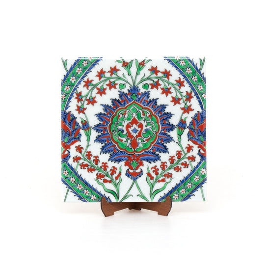 This Iznik tile & ceramic, like tiles produced during the Ottoman period, contains a high percentage of quartz and is entirely handcrafted. A glossy glaze is applied to the final layer.