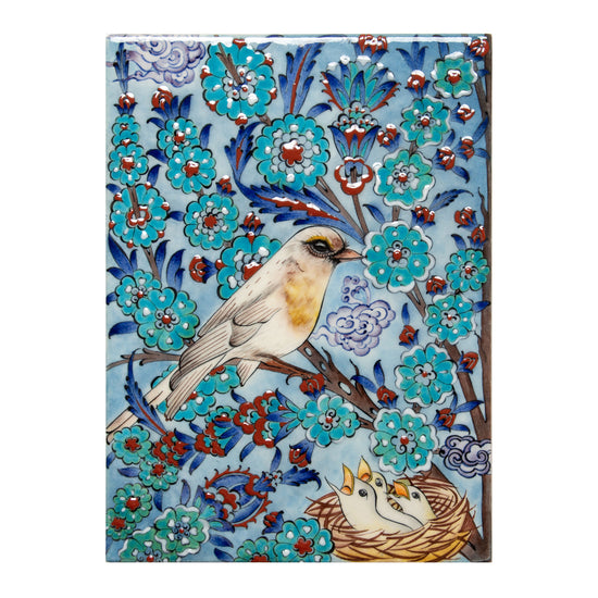 Anne kuşun civcivleriyle sevgi dolu anını betimleyen bu İznik çini pano, doğanın şefkatini ve aile bağlarını sanatsal bir dille yansıtıyor. Geleneksel el işçiliğiyle hazırlanmış motifler, Osmanlı çini sanatının zarafetini modern mekanlara taşıyor. Her bir İznik çinisi, usta zanaatkârlar tarafından tamamen el işçiliğiyle üretilmiştir.