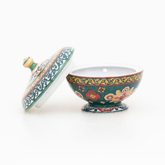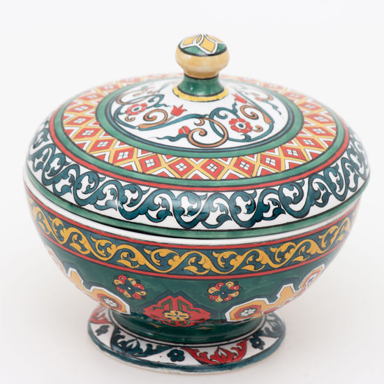 Geleneksel motiflerin güçlü bir yorumuyla hazırlanan bu İznik çinisi şekerlik, etnik desenleri ve zengin renkleri ile dikkat çekiyor. Sanatsal detaylarıyla sofralarınıza estetik bir hava katan bu çini şekerlik, işlevselliği ve dekoratif özelliğiyle ön plana çıkıyor.