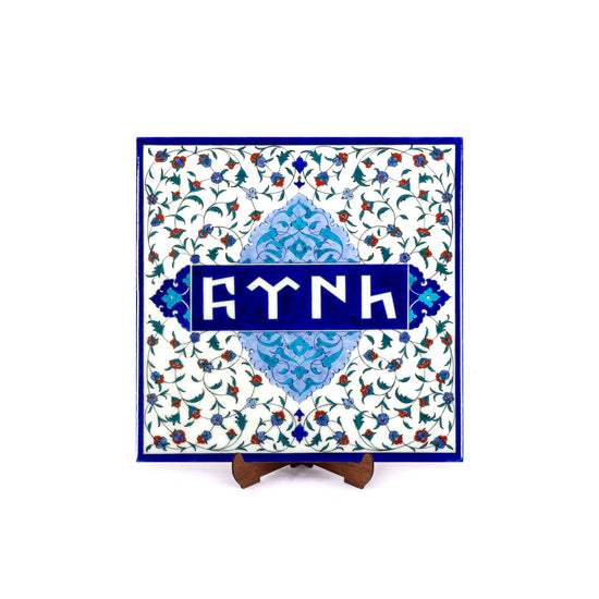 Bu özel çini tasarımında, klasik Osmanlı çini sanatının zarif çiçek ve rumi motifleri, Göktürk alfabesiyle yazılmış “TÜRK” kelimesiyle birleştirilmiştir. Geçmişin sembolleriyle bezenmiş bu kompozisyon, hem estetik bir bütünlük hem de tarihsel bir saygı duruşu niteliği taşır.