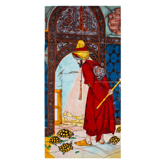 Bu çini pano, Osman Hamdi Bey’in 1906 ve 1907 yıllarında yaptığı iki farklı “Kaplumbağa Terbiyecisi” tablosundan ilham alınarak hazırlanmıştır. Figür detayları, mimari öğeler ve renk kompozisyonu, tablonun çini yüzeyde yeniden hayat bulmasını sağlar.