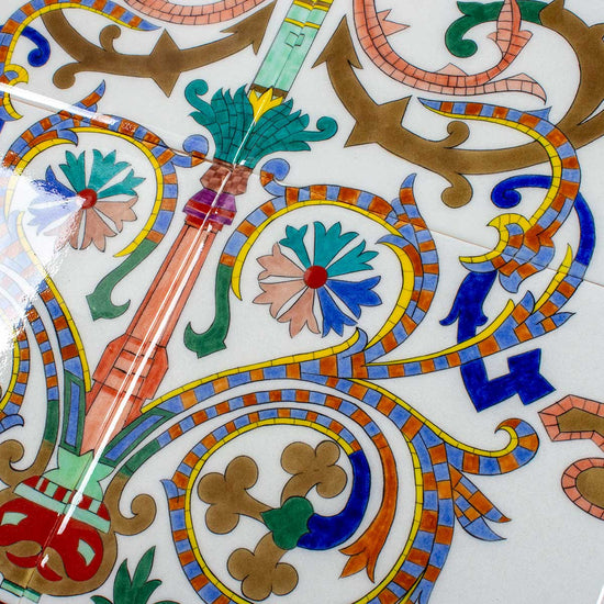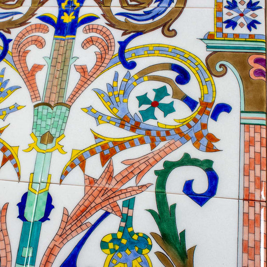 Bu 50×100 cm özel çini pano, tarihsel mozaik kompozisyonlarının zarif estetiğini İznik çinisi ile buluşturan seçkin bir tasarımdır. Roma ve Bizans dönemine ait mozaik dekorasyonlarından, ayrıca 19. yüzyılın neo-bizans ve oriental revival tarzı mimari iç dekor anlayışından ilham alan desen, güçlü bir görsel kimlik sunar. Kıvrımlı bitkisel motifler, stilize formlar ve dengeli simetri yapısı; geçmişin sanat mirasını günümüz mimarisine taşır.