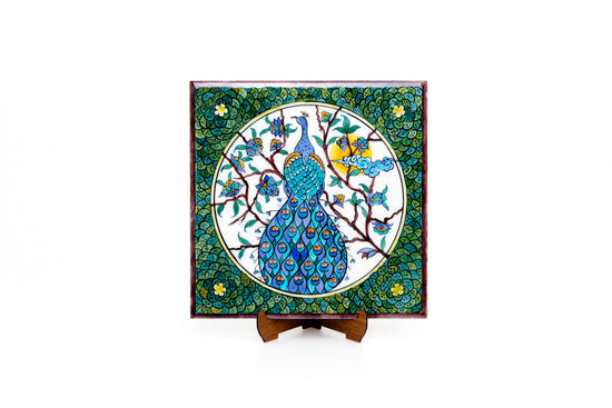 Bu tasarımda, cennet kuşu olarak da bilinen tavus kuşu doğayla iç içe bir kompozisyonla çini yüzeyine aktarılmıştır. Mitolojik anlatımlarda ölümsüzlük ve sonsuzlukla ilişkilendirilen tavus kuşu, çevresini saran çiçekli dallarla birlikte betimlenmiştir. Her bir İznik çinisi, usta zanaatkarlar tarafından tamamen el işçiliğiyle üretilmiştir. Desen tasarımı Serap Ereyli ve İznik Mavi Çini'ye aittir.