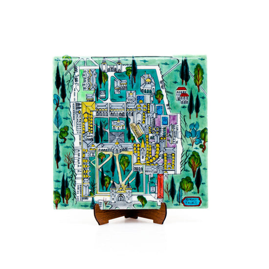 Osmanlı İmparatorluğu'nun kalbi olan Topkapı Sarayı, bu İznik çini karosunda minyatür sanatının zarafetiyle tasvir edilmiştir. Sarayın bahçeleri, yapıları ve tarihi detayları ince bir işçilikle işlendiği bu özel eser, mekanlarınıza tarihi bir derinlik ve sanatsal bir atmosfer kazandırır. Her bir İznik çinisi, usta zanaatkarlar tarafından tamamen el işçiliğiyle üretilmiştir. Desen tasarımı Serap Ereyli ve İznik Mavi Çini'ye aittir.